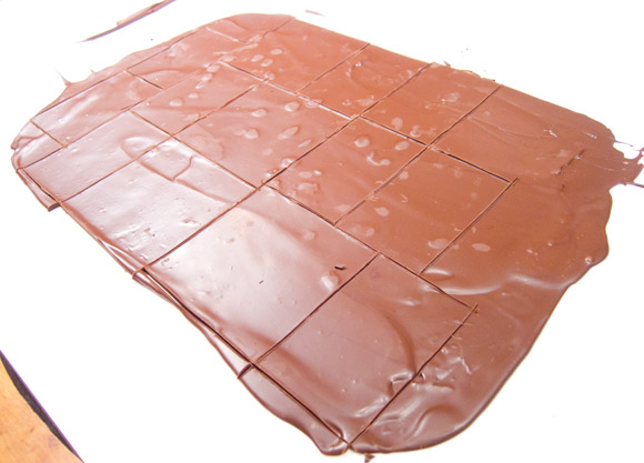 With the chocolate ready, we moved on to our project of the night: making boxes. Being the odd one out in the class meant that I got to hog the entire pot of chocolate and make two boxes. I began by spreading an even layer of chocolate on to a large sheet of parchment, shaking the parchment to smooth things out. I waited (more waiting!) for a few minutes for the chocolate to set, then got to cutting.